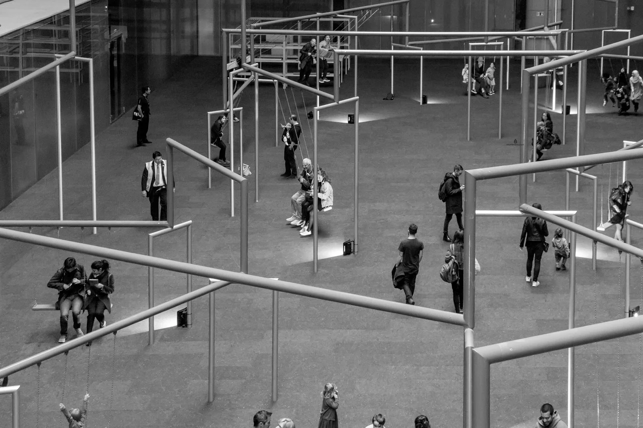 Tate Modern. This modern and contemporary art gallery is based in the old Bankside Power Station, an industrial building on the south bank of the river Thames (very close to Millenium bridge, and on the opposite side of the river from St Paul's Cathedral). After the old power station closed in 1981, the building remained unused for years, until Tate gallery announced in 1994 that it will be home to new Tate Modern. The renovation project was completed in 2000 by architect duo Herzog and de Meuron (and here is a very interesting article about its renovation). The building is enormous, with giant open space of former turbine hall- at this moment it hosts an installation by Danish artists' collective Superflex called One Two Three Swing! It is a line of swings, for 3 persons each, and from what we've seen, everyone went crazy about it (including us). There were teenage schools kids, elderly couples, parents with small kids, millennials, all of us anxiously waiting to take a spot. After we had our fair share of the fun, we noticed a dad with a kid waiting for a seat. "Please take a seat, this is for children after all.", said Luka. "We're all children!", said the waiting dad. There is a very interesting permanent collection on the upper floors, along with temporary exhibitions and an amazing shop, so interesting that we spent the entire morning there and then got back the other day.