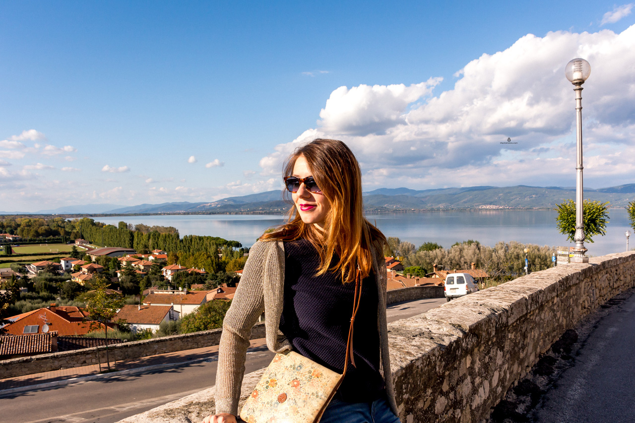 The landscape around Trasimeno lake might be one of the most beautiful I've ever seen, the thing you have in mind when someone mentions Italian countryside- hillsides dotted with olive trees, pines, and cypresses, surrounding a lake the color of the clouds with three islets floating in the middle of it all. Then there are the little towns (some of them sleepy, some of them lively), with their cobbled streets, lake views, castles, lazy cats, ceramic ateliers and local delicacies spreading in front of the shops. My wish to see this landscape came from, again, Frances Mayes- her carefree wanderings around the lake made me imagine the two of us driving from town to town, detouring for one or another little castle, eating fried or stuffed lake fish with a glass of Colli del Trasimeno wine.